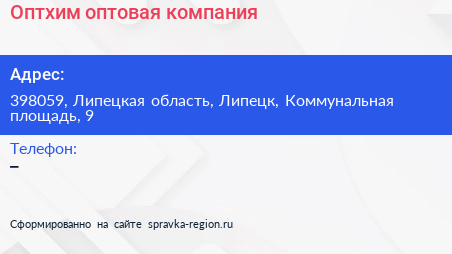 Оптхим, оптовая компания по адресу 398059, Липецкая область, Липецк, Коммунальная площадь, 9 в дальнейшем Организация, размещена в следующих категориях: