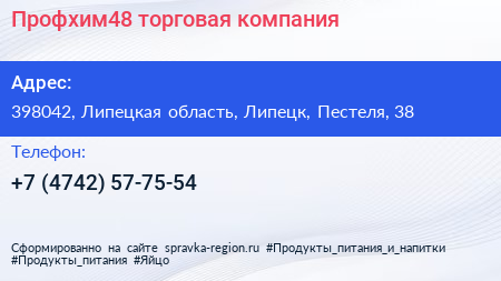 Профхим48, торговая компания по адресу 398042, Липецкая область, Липецк, Пестеля, 38 в дальнейшем Организация, размещена в следующих категориях: