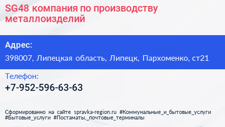 SG48, компания по производству металлоизделий по адресу 398007, Липецкая область, Липецк, Пархоменко, ст21 в дальнейшем Организация, размещена в следующих категориях: