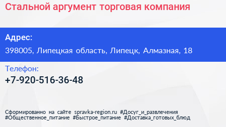 Стальной-аргумент, торговая компания по адресу 398005, Липецкая область, Липецк, Алмазная, 18 в дальнейшем Организация, размещена в следующих категориях: