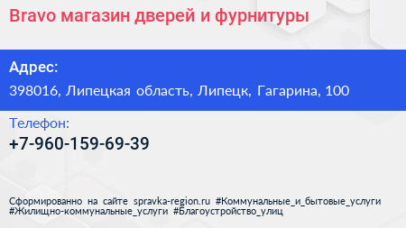 Bravo, магазин дверей и фурнитуры по адресу 398016, Липецкая область, Липецк, Гагарина, 100 в дальнейшем Организация, размещена в следующих категориях: