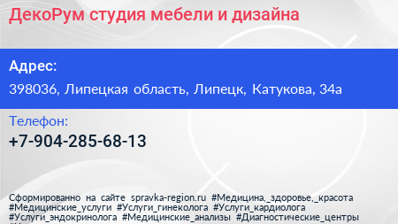 ДекоРум, студия мебели и дизайна по адресу 398036, Липецкая область, Липецк, Катукова, 34а в дальнейшем Организация, размещена в следующих категориях: