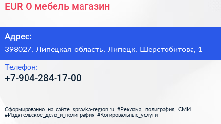 EUR.O мебель, магазин по адресу 398027, Липецкая область, Липецк, Шерстобитова, 1 в дальнейшем Организация, размещена в следующих категориях: