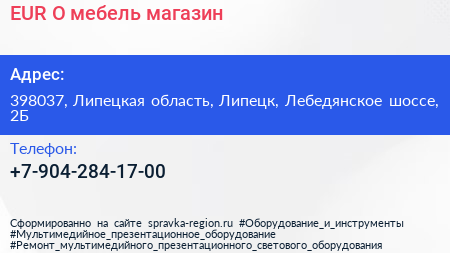 EUR.O мебель, магазин по адресу 398037, Липецкая область, Липецк, Лебедянское шоссе, 2Б в дальнейшем Организация, размещена в следующих категориях: