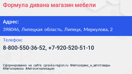 Формула дивана, магазин мебели по адресу 398046, Липецкая область, Липецк, Меркулова, 2 в дальнейшем Организация, размещена в следующих категориях: