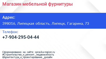 Магазин мебельной фурнитуры по адресу 398016, Липецкая область, Липецк, Гагарина, 73 в дальнейшем Организация, размещена в следующих категориях: