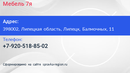 Мебель 7я по адресу 398002, Липецкая область, Липецк, Балмочных, 11 в дальнейшем Организация, размещена в следующих категориях: