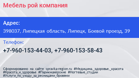 Мебель рой, компания по адресу 398037, Липецкая область, Липецк, Боевой проезд, 39 в дальнейшем Организация, размещена в следующих категориях: