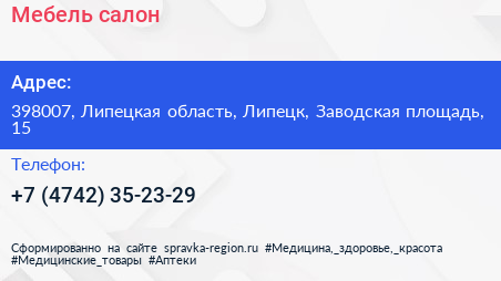 Мебель, салон по адресу 398007, Липецкая область, Липецк, Заводская площадь, 15 в дальнейшем Организация, размещена в следующих категориях: