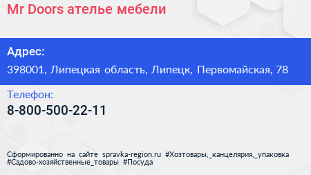 Mr.Doors, ателье мебели по адресу 398001, Липецкая область, Липецк, Первомайская, 78 в дальнейшем Организация, размещена в следующих категориях: