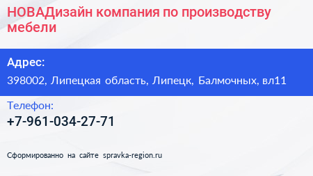 НОВАДизайн, компания по производству мебели по адресу 398002, Липецкая область, Липецк, Балмочных, вл11 в дальнейшем Организация, размещена в следующих категориях: