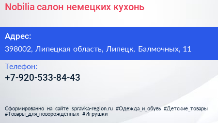 Nobilia, салон немецких кухонь по адресу 398002, Липецкая область, Липецк, Балмочных, 11 в дальнейшем Организация, размещена в следующих категориях: