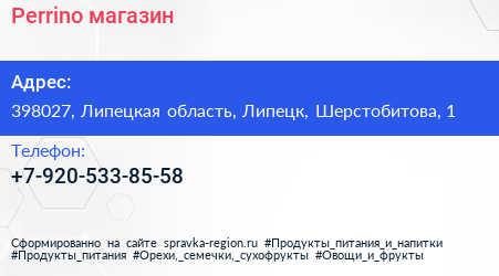 Perrino, магазин по адресу 398027, Липецкая область, Липецк, Шерстобитова, 1 в дальнейшем Организация, размещена в следующих категориях: