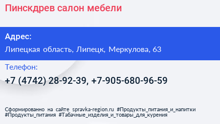 Пинскдрев, салон мебели по адресу Липецкая область, Липецк, Меркулова, 63 в дальнейшем Организация, размещена в следующих категориях: