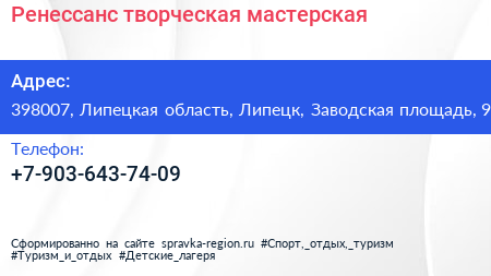 Ренессанс, творческая мастерская по адресу 398007, Липецкая область, Липецк, Заводская площадь, 9 в дальнейшем Организация, размещена в следующих категориях: