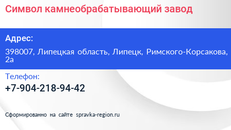 Символ, камнеобрабатывающий завод по адресу 398007, Липецкая область, Липецк, Римского-Корсакова, 2а в дальнейшем Организация, размещена в следующих категориях: