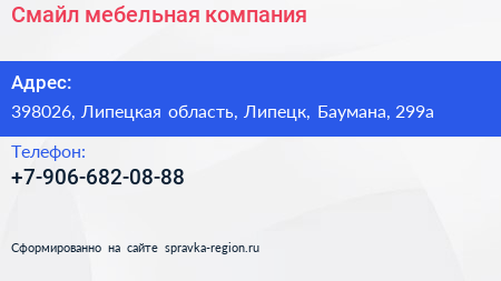 Смайл, мебельная компания по адресу 398026, Липецкая область, Липецк, Баумана, 299а в дальнейшем Организация, размещена в следующих категориях: