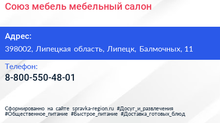 Союз мебель, мебельный салон по адресу 398002, Липецкая область, Липецк, Балмочных, 11 в дальнейшем Организация, размещена в следующих категориях: