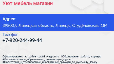 Уют мебель, магазин по адресу 398007, Липецкая область, Липецк, Студёновская, 184 в дальнейшем Организация, размещена в следующих категориях: