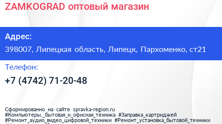 ZAMKOGRAD, оптовый магазин по адресу 398007, Липецкая область, Липецк, Пархоменко, ст21 в дальнейшем Организация, размещена в следующих категориях: