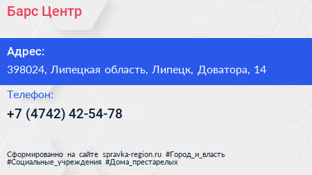Барс-Центр по адресу 398024, Липецкая область, Липецк, Доватора, 14 в дальнейшем Организация, размещена в следующих категориях:
