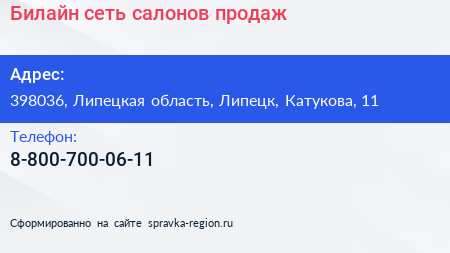 Билайн, сеть салонов продаж по адресу 398036, Липецкая область, Липецк, Катукова, 11 в дальнейшем Организация, размещена в следующих категориях: