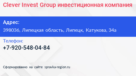 Clever Invest Group, инвестиционная компания по адресу 398036, Липецкая область, Липецк, Катукова, 34а в дальнейшем Организация, размещена в следующих категориях:
