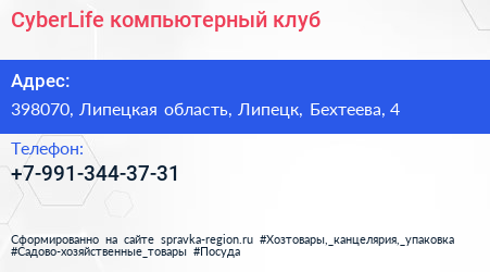 CyberLife, компьютерный клуб по адресу 398070, Липецкая область, Липецк, Бехтеева, 4 в дальнейшем Организация, размещена в следующих категориях: