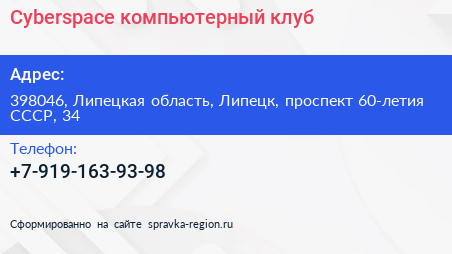 Cyberspace, компьютерный клуб по адресу 398046, Липецкая область, Липецк, проспект 60-летия СССР, 34 в дальнейшем Организация, размещена в следующих категориях: