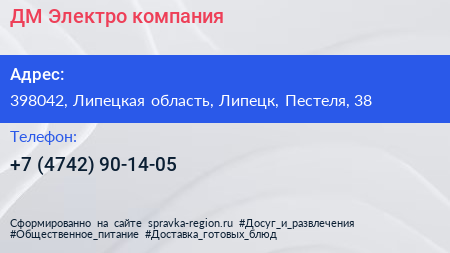 ДМ Электро, компания по адресу 398042, Липецкая область, Липецк, Пестеля, 38 в дальнейшем Организация, размещена в следующих категориях: