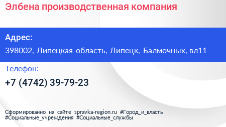 Элбена, производственная компания по адресу 398002, Липецкая область, Липецк, Балмочных, вл11 в дальнейшем Организация, размещена в следующих категориях: