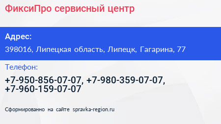 ФиксиПро, сервисный центр по адресу 398016, Липецкая область, Липецк, Гагарина, 77 в дальнейшем Организация, размещена в следующих категориях: