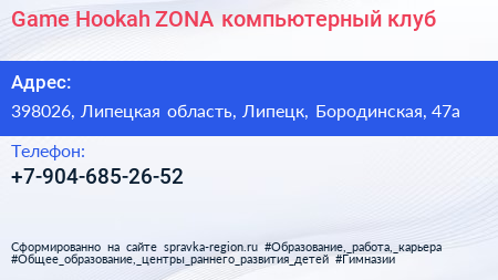 Game & Hookah ZONA, компьютерный клуб по адресу 398026, Липецкая область, Липецк, Бородинская, 47а в дальнейшем Организация, размещена в следующих категориях: