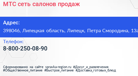 МТС, сеть салонов продаж по адресу 398046, Липецкая область, Липецк, Петра Смородина, 13а в дальнейшем Организация, размещена в следующих категориях: