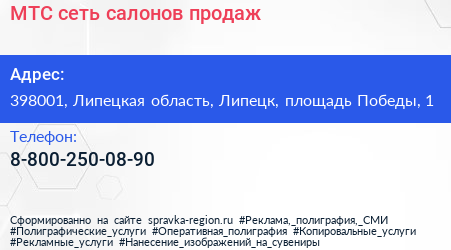 МТС, сеть салонов продаж по адресу 398001, Липецкая область, Липецк, площадь Победы, 1 в дальнейшем Организация, размещена в следующих категориях: