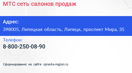 МТС, сеть салонов продаж по адресу 398005, Липецкая область, Липецк, проспект Мира, 35 в дальнейшем Организация, размещена в следующих категориях: