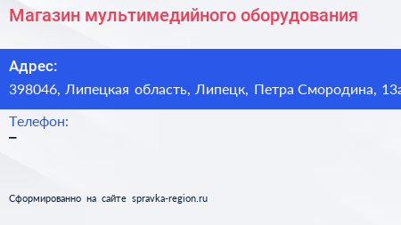 Магазин мультимедийного оборудования по адресу 398046, Липецкая область, Липецк, Петра Смородина, 13а в дальнейшем Организация, размещена в следующих категориях: