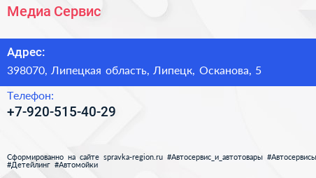 Медиа Сервис по адресу 398070, Липецкая область, Липецк, Осканова, 5 в дальнейшем Организация, размещена в следующих категориях:
