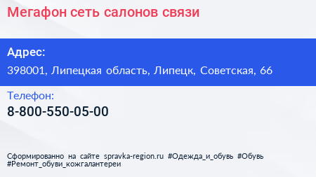Мегафон, сеть салонов связи по адресу 398001, Липецкая область, Липецк, Советская, 66 в дальнейшем Организация, размещена в следующих категориях: