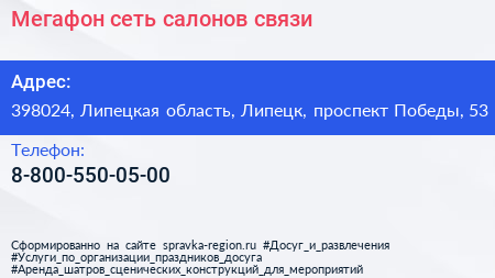 Мегафон, сеть салонов связи по адресу 398024, Липецкая область, Липецк, проспект Победы, 53 в дальнейшем Организация, размещена в следующих категориях: