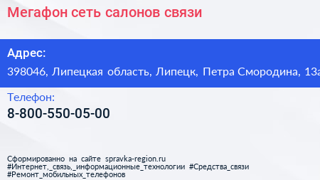 Мегафон, сеть салонов связи по адресу 398046, Липецкая область, Липецк, Петра Смородина, 13а в дальнейшем Организация, размещена в следующих категориях: