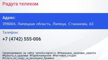 Радуга телеком по адресу 398004, Липецкая область, Липецк, Стаханова, 63 в дальнейшем Организация, размещена в следующих категориях:
