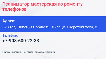 Реаниматор, мастерская по ремонту телефонов по адресу 398027, Липецкая область, Липецк, Шерстобитова, 8 в дальнейшем Организация, размещена в следующих категориях: