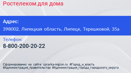Ростелеком для дома по адресу 398002, Липецкая область, Липецк, Терешковой, 35а в дальнейшем Организация, размещена в следующих категориях: