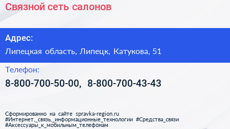 Связной, сеть салонов по адресу Липецкая область, Липецк, Катукова, 51 в дальнейшем Организация, размещена в следующих категориях: