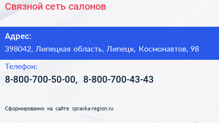 Связной, сеть салонов по адресу 398042, Липецкая область, Липецк, Космонавтов, 98 в дальнейшем Организация, размещена в следующих категориях: