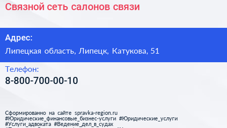 Связной, сеть салонов связи по адресу Липецкая область, Липецк, Катукова, 51 в дальнейшем Организация, размещена в следующих категориях: