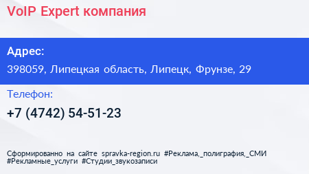 VoIP Expert, компания по адресу 398059, Липецкая область, Липецк, Фрунзе, 29 в дальнейшем Организация, размещена в следующих категориях: