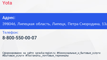 Yota по адресу 398046, Липецкая область, Липецк, Петра Смородина, 13а в дальнейшем Организация, размещена в следующих категориях: