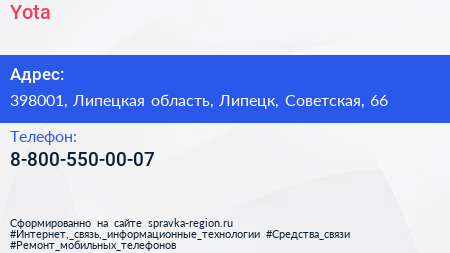 Yota по адресу 398001, Липецкая область, Липецк, Советская, 66 в дальнейшем Организация, размещена в следующих категориях: